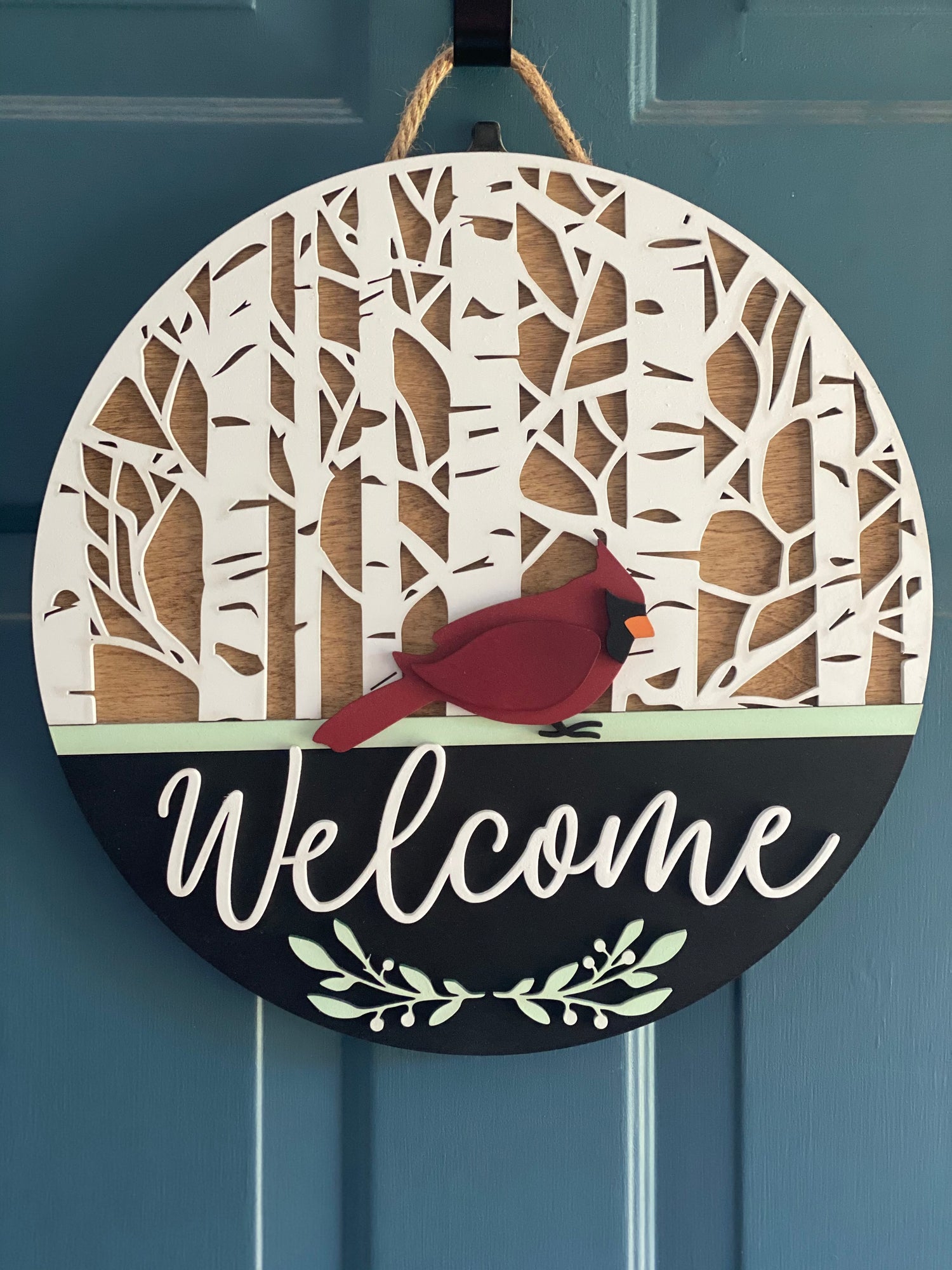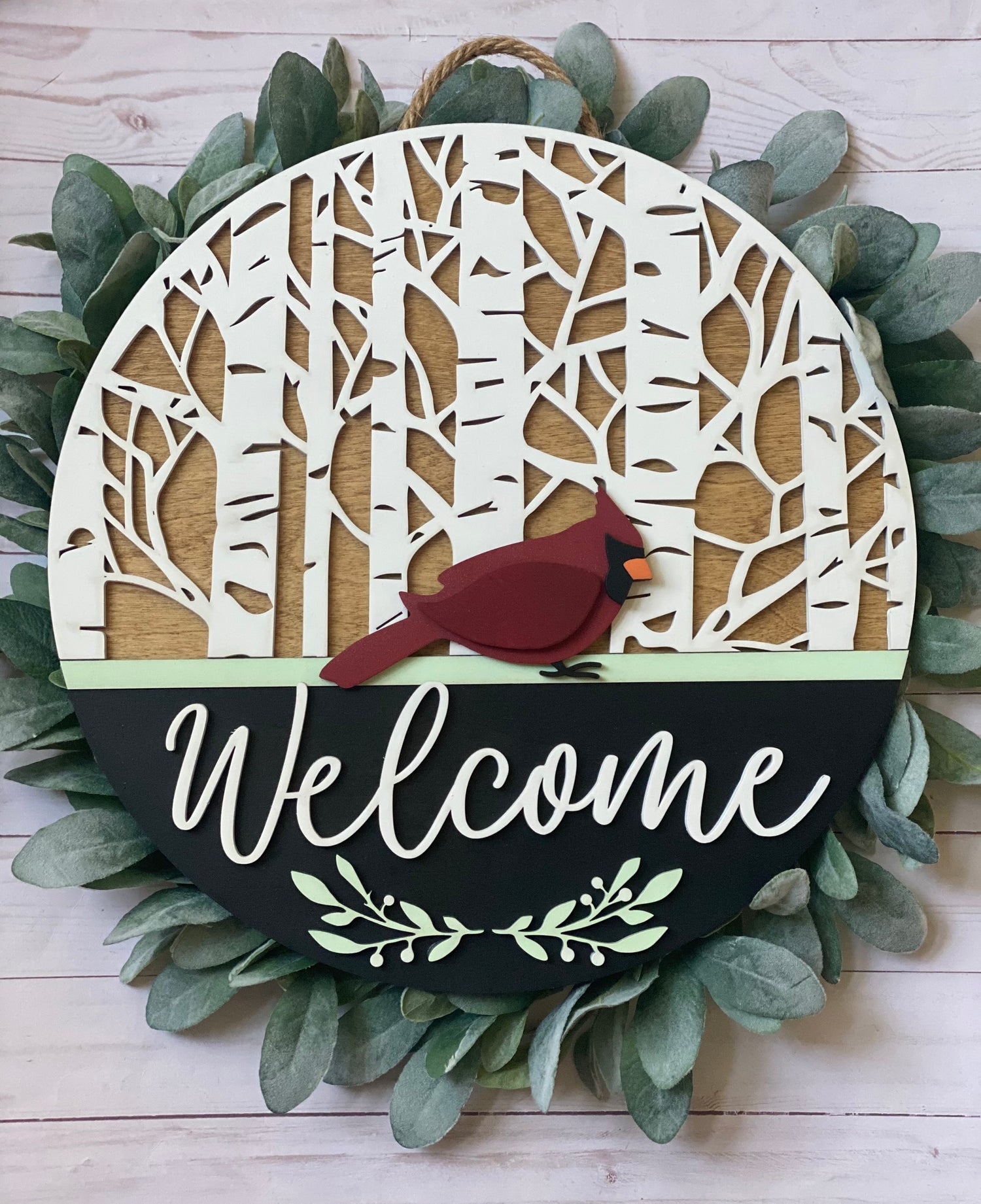Cardinal 15inch round door hanger. Laser cut from birch wood. Comes ready to hang. Green wreath is not included.
