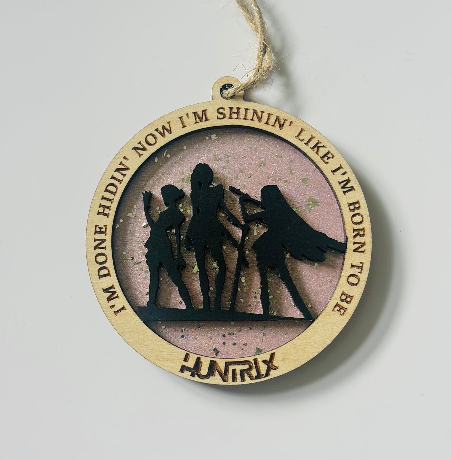 A powerful ornament for K-Pop Demon Hunters fans! This layered wood ornament features a trio of bold silhouettes with a glittery pink backdrop and the engraved lyric: