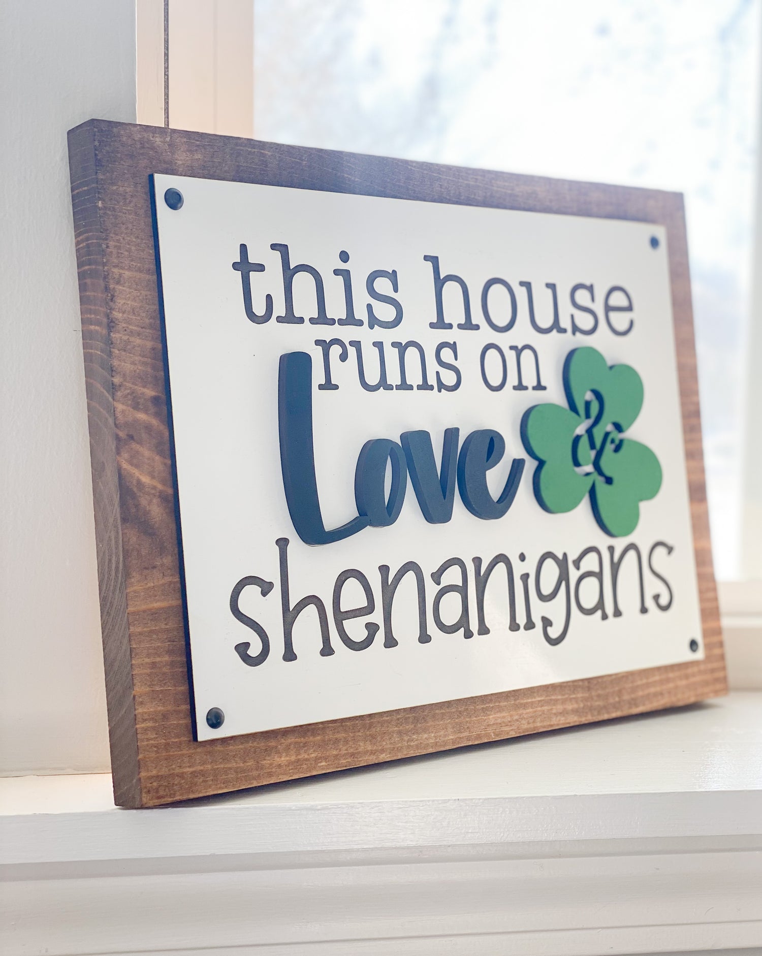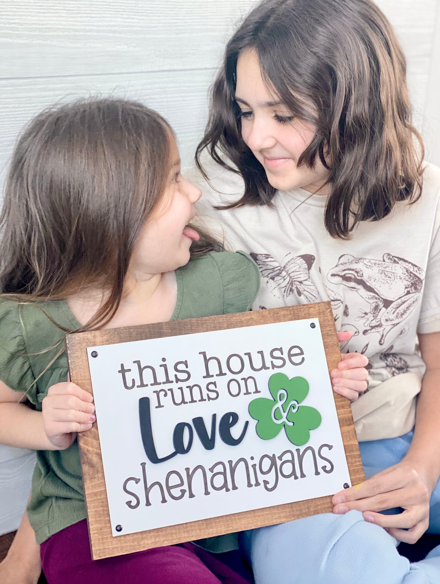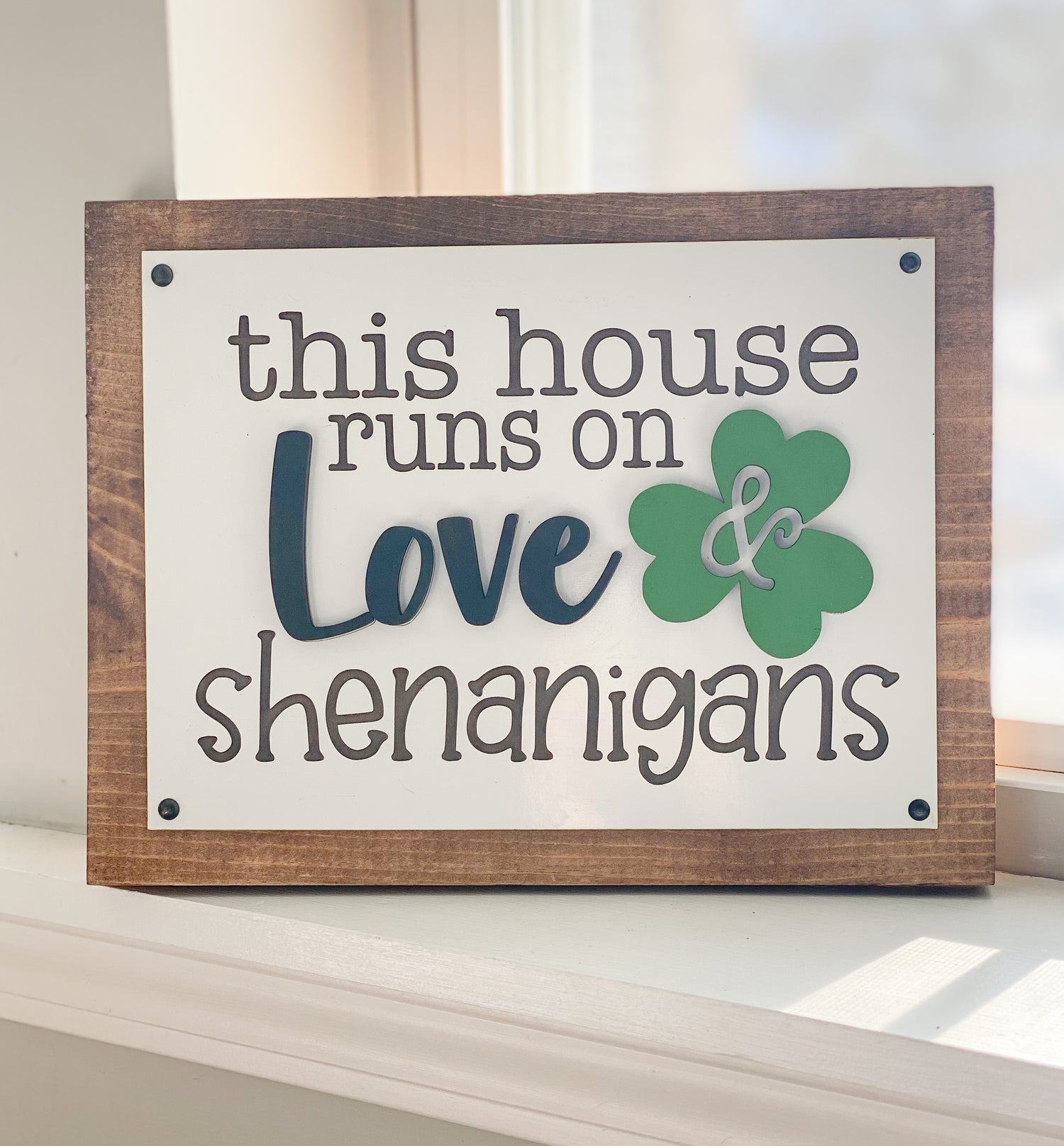 Love & Shenanigans wood plaque style sign. Sign is laser cut & engraved. Approximately 9x12inches in size.
