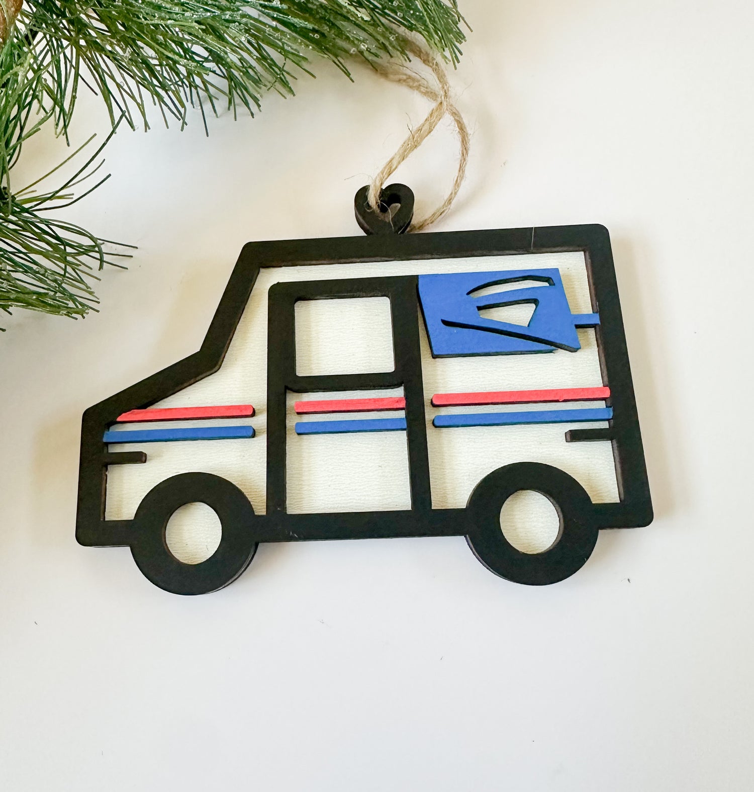 Each ornament is laser cut and hand-painted with clean, crisp details. The layered design gives dimension to the truck shape, the stripes, and the USPS-style mailbox logo. Comes ready to hang with natural jute twine.