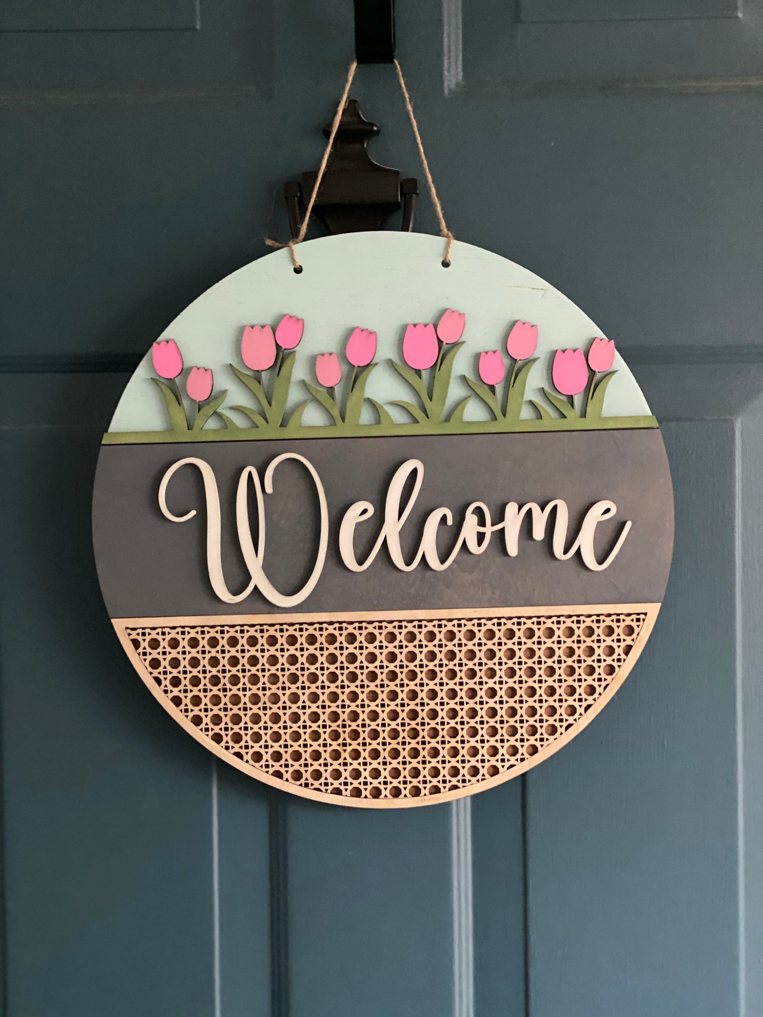 Welcome- Spring tulip door hanger. 15inches round in size.